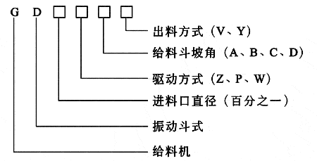 如GD06PA為直徑φ600mm平旋型振動給料斗,斗體坡角30°,中心出料。