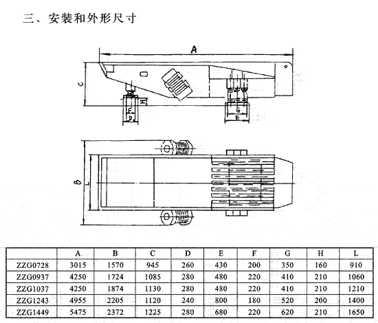 機(jī)器由箱體、振動(dòng)電機(jī)、柵條排和彈簧減振裝置等四部分組成。箱體為一剛性結(jié)構(gòu),內(nèi)測(cè) 與物料接為雙臺(tái)階式,間隙呈楔形以利徘料,柵條材質(zhì)為耐磨高錳鋼。減振裝置采用優(yōu)質(zhì)螺旋 彈簧。