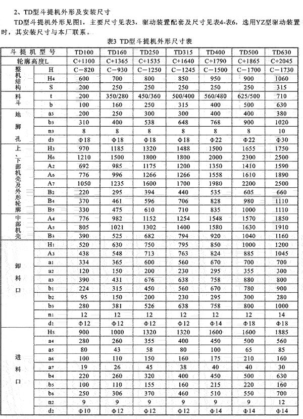 二、TD型斗式提升機(一)技術(shù)性能(表2)(二)主要結(jié)構(gòu)1、TD型斗提機結(jié)構(gòu)型式(1)傳動裝置 TD型斗提機的傳動裝置有兩種形式,分別配有YZ型減速器或ZQ(YY)型減速器。YZ型軸裝減速器直接套裝在主軸軸頭上,省去了傳動平臺、聯(lián)軸器等,便結(jié)構(gòu)緊湊,重量輕,而且其內(nèi)部帶有異型輥逆止器,逆止可靠。該減速器噪聲低,運轉(zhuǎn)平穩(wěn),并隨主軸浮動,可消除安裝應(yīng)力。(2)TD型斗提機備有四種料斗Q型(淺斗)、H型(弧底斗)、ZD型(中深斗)、SD型(深 斗)表2 TD型斗提機技術(shù)性能