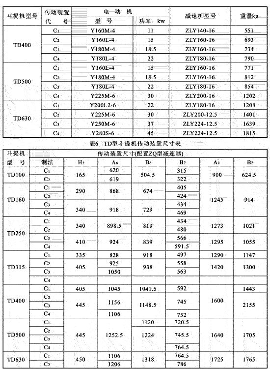 目前國內(nèi)常用的斗提機均為垂直式,較新型符合標(biāo)準(zhǔn)TB3926--85的有TD型、TH型它們的主要特征、用途及型號見表l